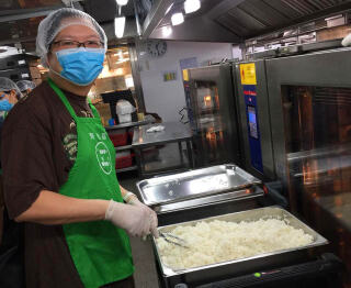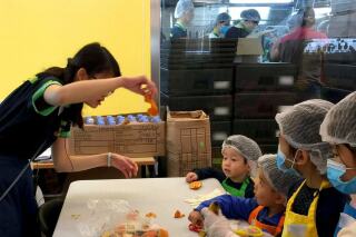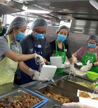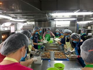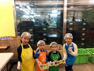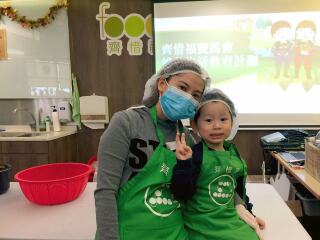 一群义工带同子女来到社区厨房,分别制作爱心饭盒和参与赛马会绿色生活教育计划的活动。
