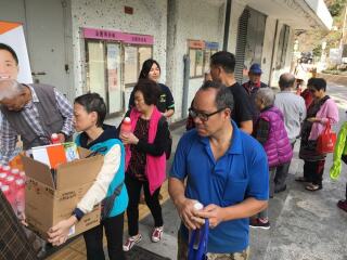 于田兴村派发由玛莎捐赠的乳酪,蔬菜和面包