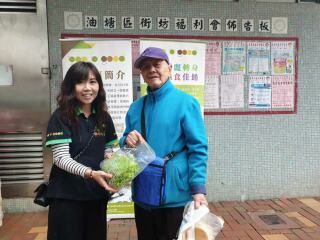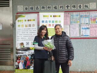 齐惜福于油塘邨派发剩菜。