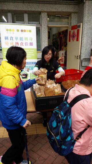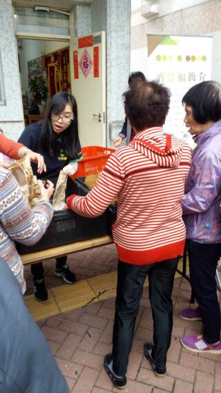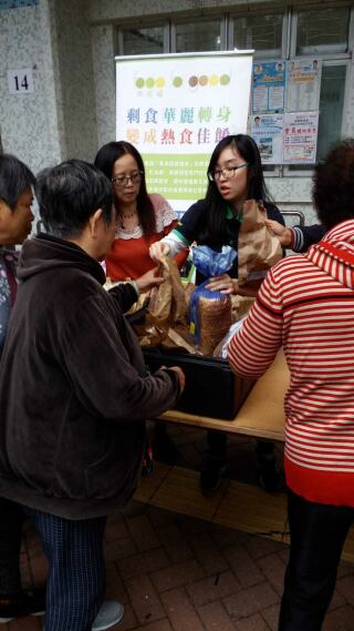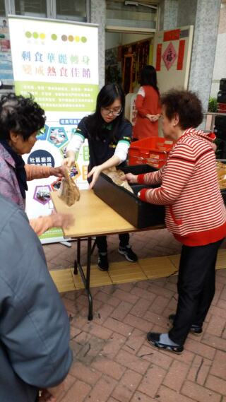 齐惜福在秀茂坪南派发有心人捐赠面包及樽装水,同时亦向教导大家如何利用剩食制作成热食佳肴。