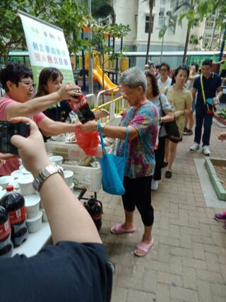 齐惜福到海丽村派发由玛莎捐赠的汽水及零食給附近的居民。