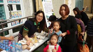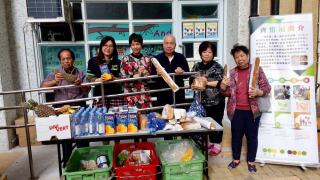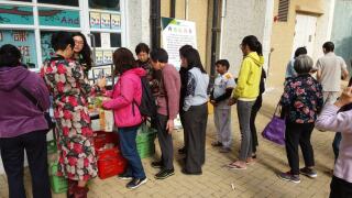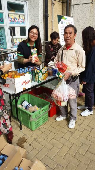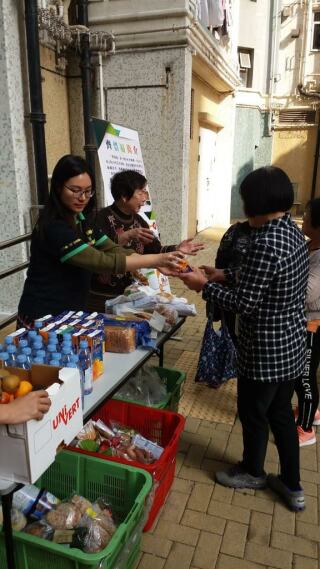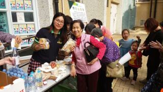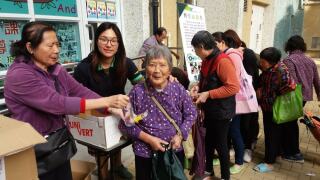 齊惜福在海麗邨派發食物給當區的居民,同時教育大家如可處理廚餘及相關知識。